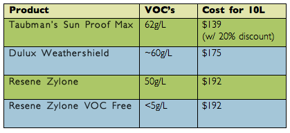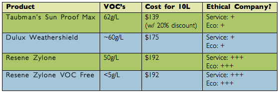 After purchasing our paint I did a comparison of other comparable paints, all latex weather proofing paints of a similar gloss. And here’s how it came out: