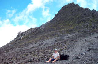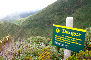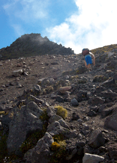 Nevertheless, we continued onward, and decided to make the quick jaunt up Fantham’s Peak and stop for lunch at the summit. Let me tell you, this was the hardest I have ever worked for lunch in my life. Mario was quite ill-informed when he estimated that the trek would take about 20 minutes; I guess the trail maps warn “not to scale; not to be used for navigation purposes” for a reason. After a long set of wooden steps that I affectionately look back on as the Stairway to Hell, the trail became a field of volcanic gravel, or scree, situated on a 45-degree or steeper incline. My chosen method of ascent was to take two steps up, slide back one, complain, take a deep breath, and repeat. John fared quite a bit better, scrambling steadily up and patiently waiting for me at the trail posts and boulders where it was safe to rest.