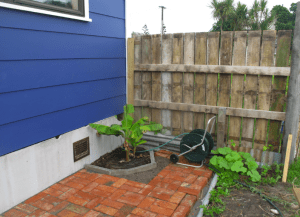 A month after putting in our banana, it is thriving in the heat trap (aka “micro-climate,” “sun trap”) we have built for it. The wooden fence (built from our old decking timber) acts as a wind screen, and the bricks and Hardie board cladding act as thermal sinks.
