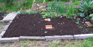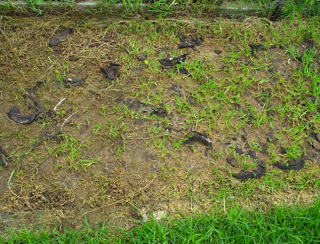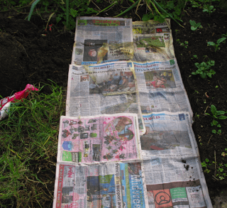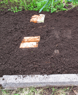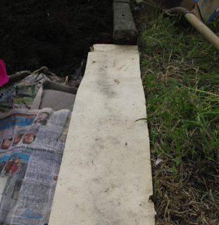 In anticipation of this organic matter coming onto our land, I “feather a nest” by forming a large rectangular bowl with grass cut on a neighbor’s property and “donated” to us by the landscaper. Into this bowl I easily dumped the organic matter collected at the YMCA event.