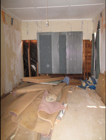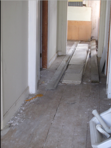 The first time we walked into our house, we saw a hallway that stretched the length of the house. It was filled with dust, rubble, and long lengths of Hardiplank.