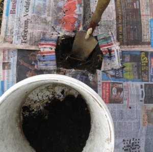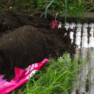 Then I added half a coal bag of sheep manure we bartered for with a surfing friend. The nitrogen in the manure will balance the high carbon content of the paper cups and napkins.