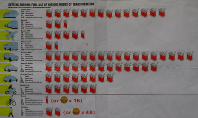 Petrol: Simply put, we want to use a little petrol as possible. This influenced the choice of location of our house. We are three blocks from a bus stop and it is a six kilometer easy bike ride on a flat road to the city centre. Below is an excellent graphic from Good magazine showing the relative fuel efficiencies of different forms of travel. Note that bicycling is the most efficient form of travel on the planet!