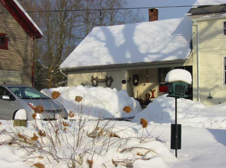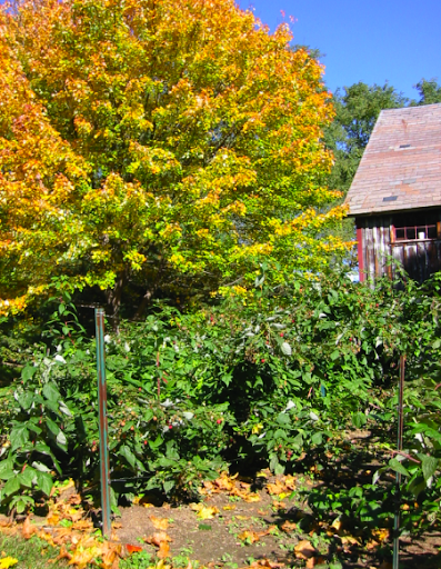 Poppy’s veggies in autumn. Notice maple tree foliage and slate roof on the barn.