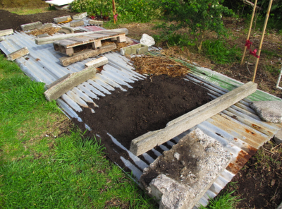 Roofing iron placed temporarily to weaken couch and kikuyu grasses.