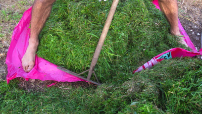 The loaded tarp is ready to go. Note that in this case the bottom has been cut open but the top zip tie has been left in place. By pulling from the bottom end the top bundles the grass so it does not fall off the back while transporting the load. The rake stays on for the ride if it is needed at the other end of the journey.