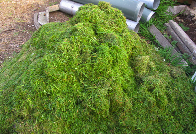 I decided I would add the grass to an existing compost pile to heat it up and finish it. The first tarp load I pulled to the edge of the compost pile and lifted the back of the tarp over.