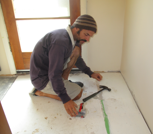 This week and next I’ll wrap up the discussion of how to make a home warm, dry, healthy and energy-efficient on a budget with a small-scale case study of our “mud room.” In the process of shifting the kitchen, bath, toilet and laundry around the lean-to section of our villa, we created a small room at the existing back door. The room measures roughly two metres by two metres, with a hot water cupboard taking up about one quarter. Both the door and the floor were anything but weather-tight.