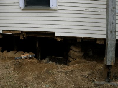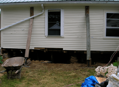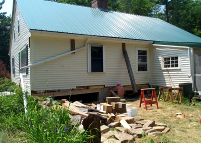 With one quarter of my home hanging by its shoulders I took a chainsaw to its ankles, cutting the sill out in sections. Once this was done, we made forms and poured footers. While Rick and I mixed 38 bags of concrete, we sent Dani into the cellar to ‘tamp’ the wet mix to remove air pockets as we shoveled it into the forms. Although she emerged from the chore hours later speckled, at least she was in the cool shade all day. I remember it was 38 degrees with bright sunshine, and it was difficult to determine who had the worse of the jobs. Although Dani did take a ‘wicked cool’ photo from her subterranean perspective.