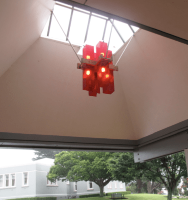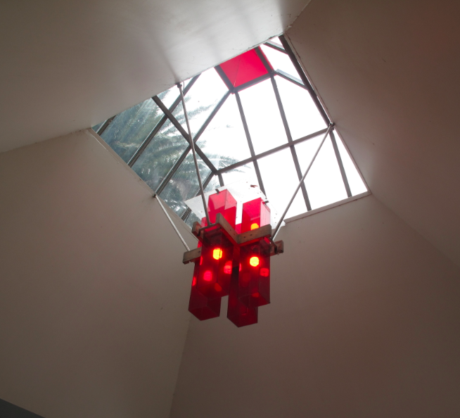 If eight light bulbs burning directly under a glass skylight with sunshine beaming through it is indeed art, I would suggest two potential titles: “Ironic”, or “Money to Burn.”