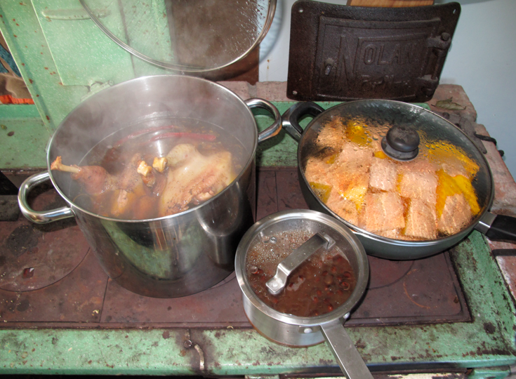 Jessea gutted the birds and then we put them in a pot with homemade veggie stock for a long boil. You can also see our homegrown pumpkins and homegrown blackbeans cooking.