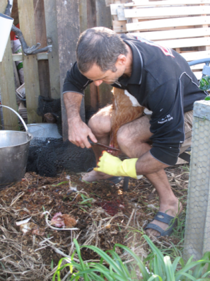 I made a killing cone and mounted it over our compost pile, but then we discovered a youtube video of a woman slitting a chicken’s throat without a cone, but just squeezing it gently between her knees. We decided to go with this option. In the video, she gently massaged the neck where she would make the cut. She also held the beak and head in an overhand grip, as you can see below. My index finger was on her beak a little like the trigger of a gun, and my thumb firm but gently head the back of her head so she would not squirm at all.
