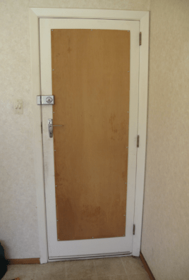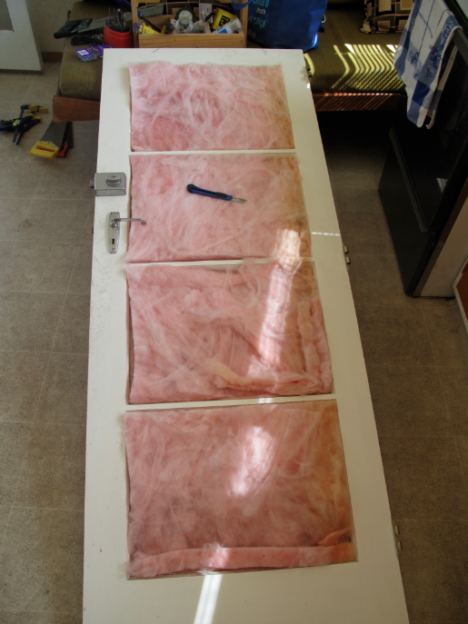 As you can see from the photographs, I took each door off its hinges, cut and placed fiberglass insulation over each pane of glass (both sides), and then screwed into place precisely cut sheets of thin plywood (both sides). The homeowner later primed and painted the ply to match.