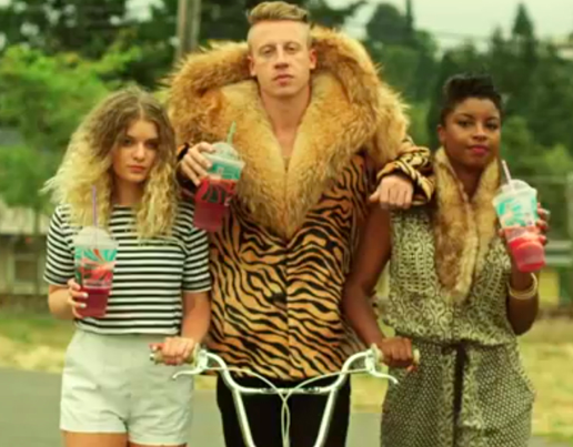 Macklemore, too, takes the piss out of consumer culture (and R. Kelly) by ridiculing those who would purchase a t-shirt for $50 (US), when one could outfit oneself from head to toe at an op shop for $20 and “look incredible.”
