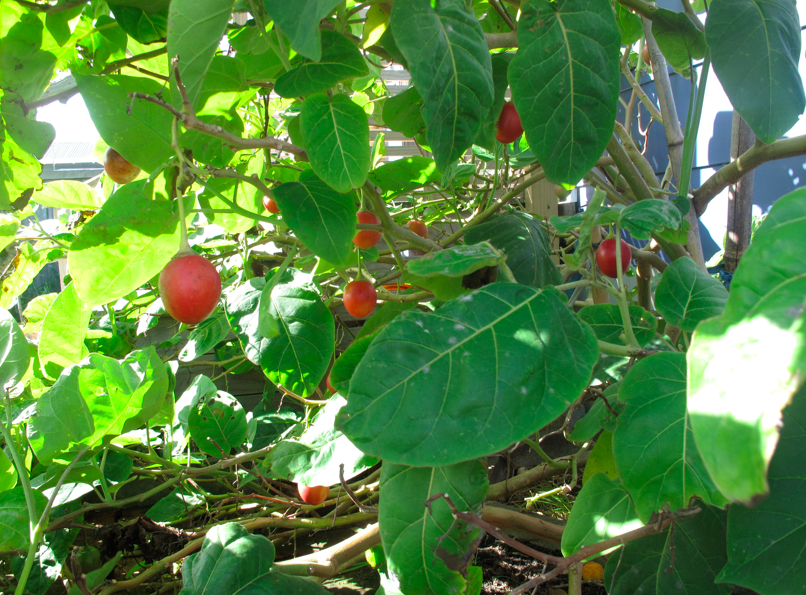 Despite a wind storm in January that caused this tamarillo tree to drop half its fruit, it is still laden.
