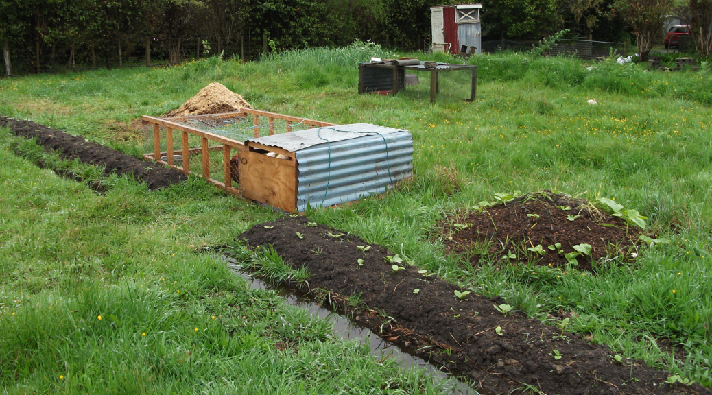 This filled during a 30 mm rain event. The water will feed the pumpkins planted along its length.