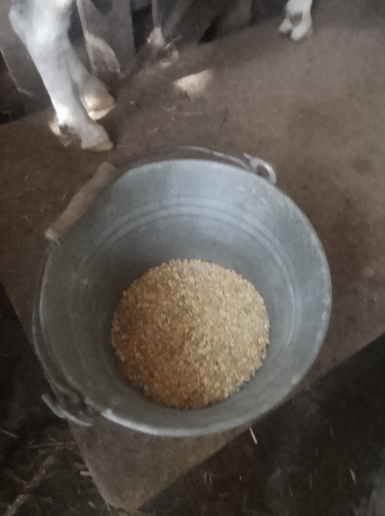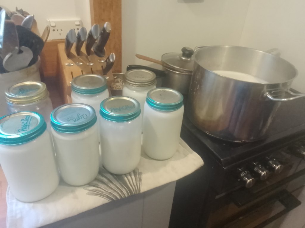 At any given time we are milking four to six goats with each giving between a litre and three litres a day. That is a lot of milk for our family of five! Here is Mindy gobbling up her tucker while being milked on the stand.