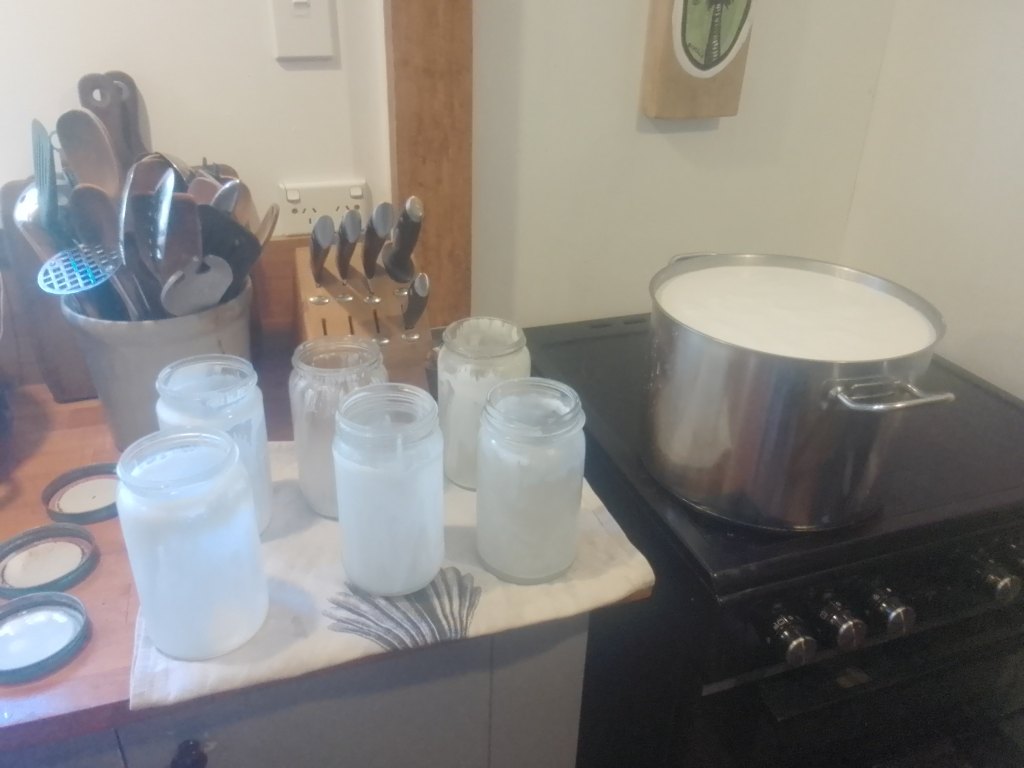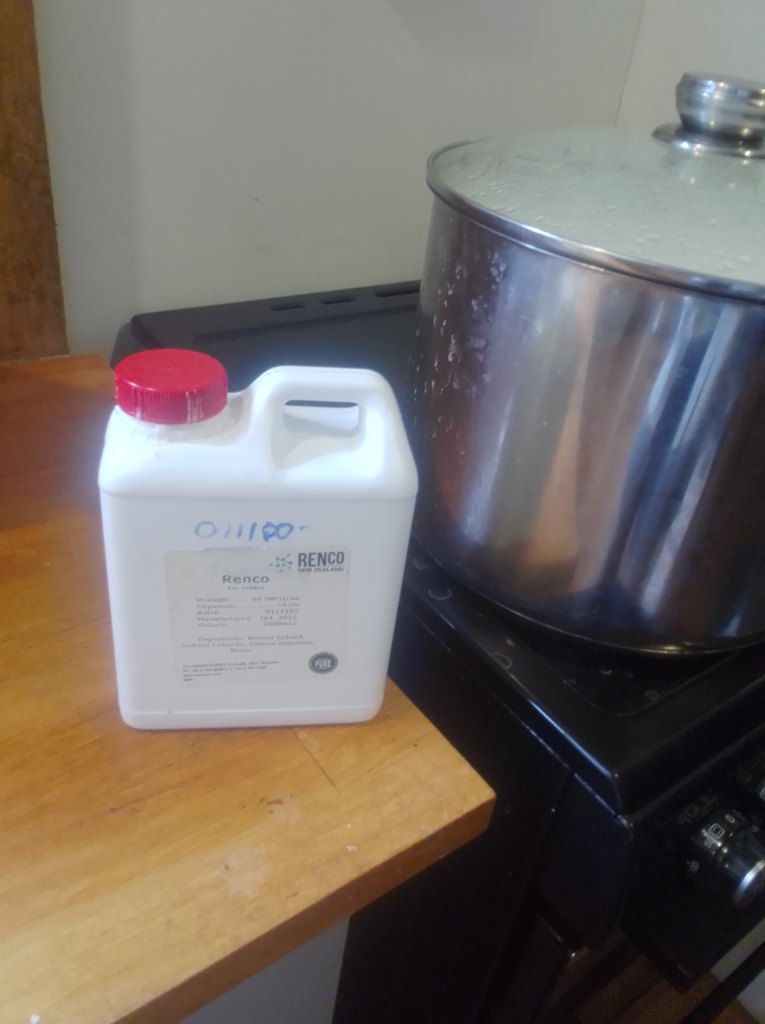Making halloumi requires rennet, which is a complex set of enzymes produced within the stomach of ruminant animals. We buy our rennet from Renco, New Zealand one litre at a time. Only 7.5 ml of rennet is required per batch, so that first litre has lasted over two years, making well over 100 batches of delicious white gold!