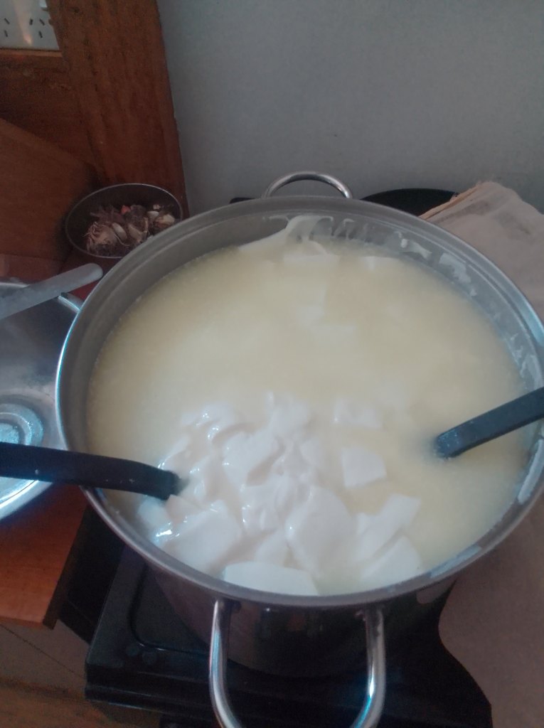 The first step for making halloumi is to fill a large pot with milk and bring it up to 35 degrees Celsius.