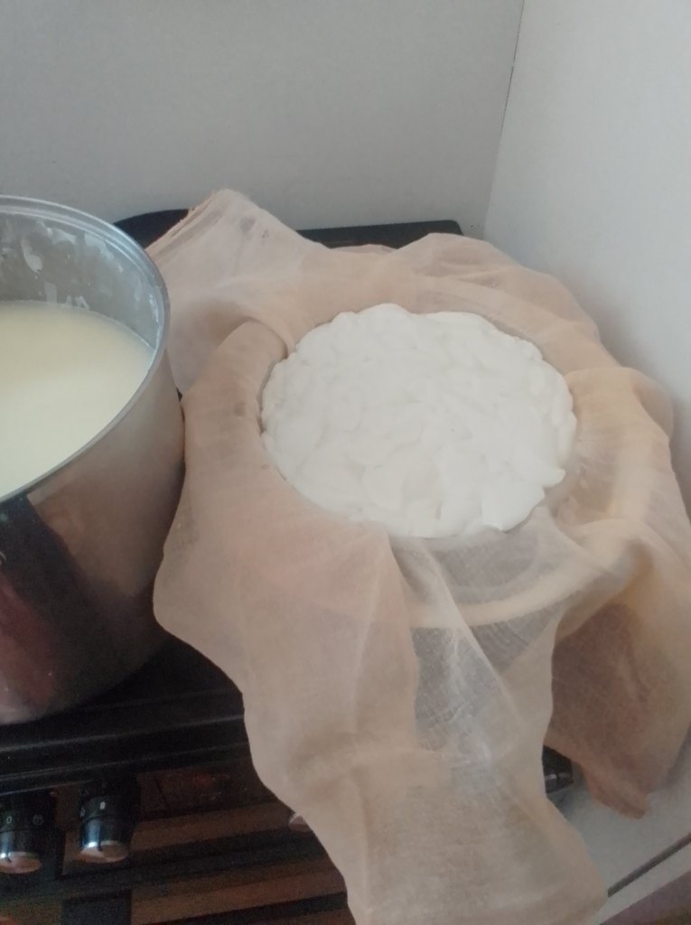 I put a colander inside a large bowl to let the whey drain out as much as possible.
