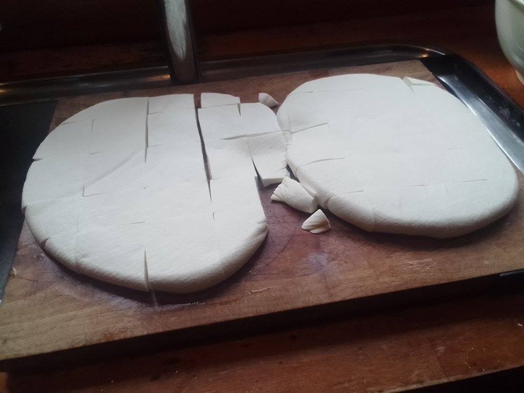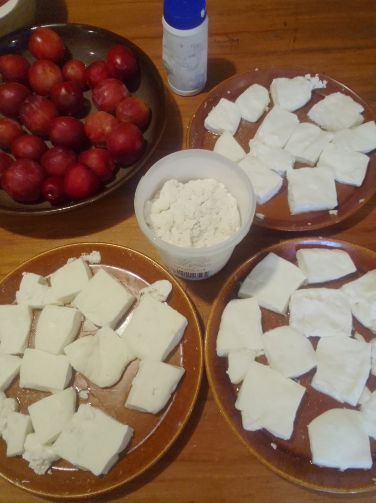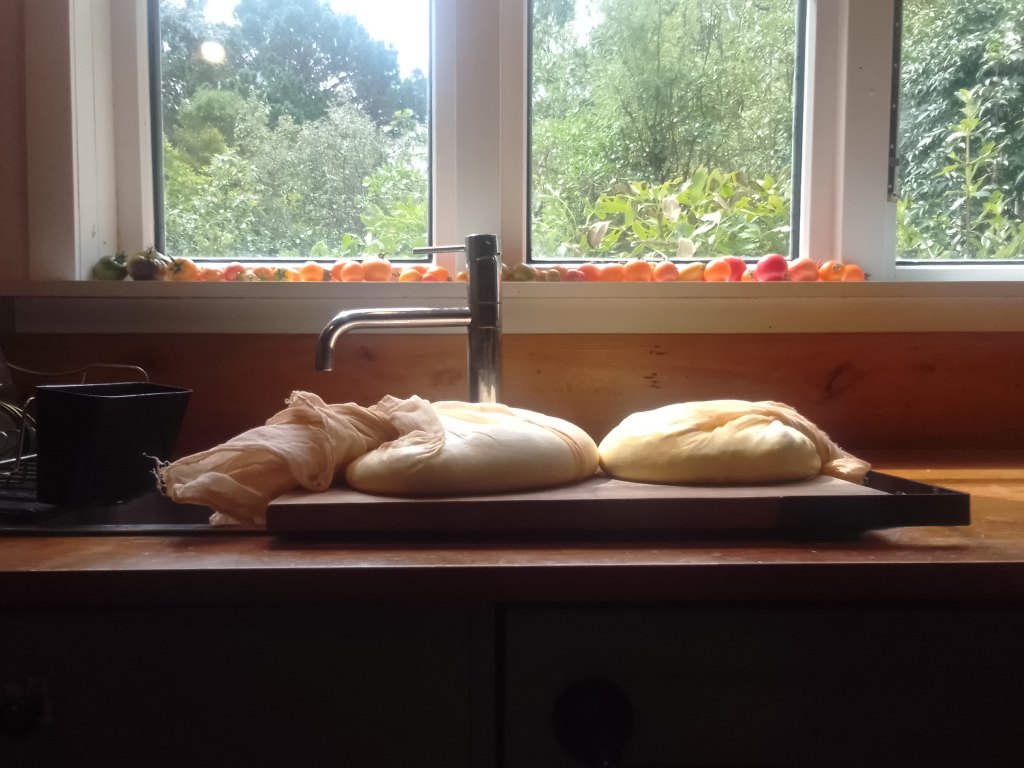 The next step requires heating the whey to somewhere below boiling point and putting the blocks back into it for 30 minutes. Fish them out and lay on plates to drain, and then salt liberally. The byproduct of this step is ricotta cheese. This can be collected separately and saved for lasagne, although our cats love eating it too.