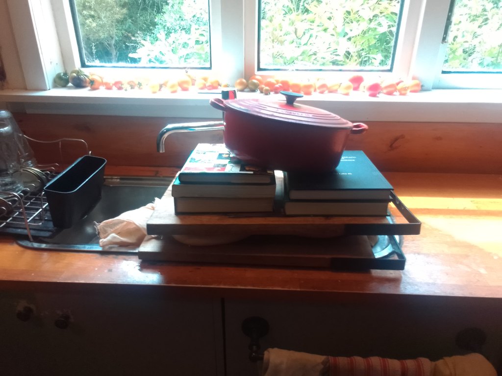 Place another large cutting board on top and add approximately 10 kilograms of weight. I use big books and a Le Creuset casserole.