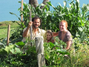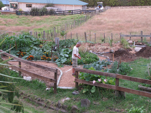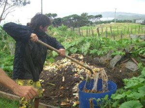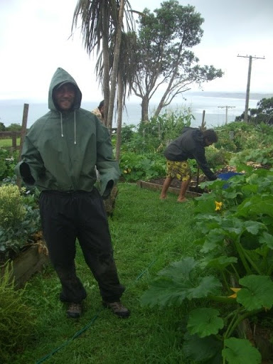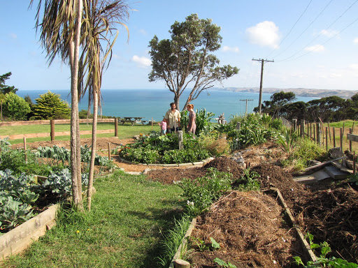 My PDC was at Rainbow Valley Farm in Matakana. It is one of the most amazing places I have ever been, and is an example of a thriving permaculture farm. Trish Allen developed the farm over the past 20 years with her husband Joe Polascher, who died suddenly last February. RVF produces honey, fruit, and vegetable for sale and runs educational courses. They raise enough milk, beef, eggs, chicken, and rice to provide for the 6 people who live on the farm. And, its gorgeous. Here is Trish, and below the house she built with Joe (it has earth walls, a living roof, and a pergola with grapes they use for wine):