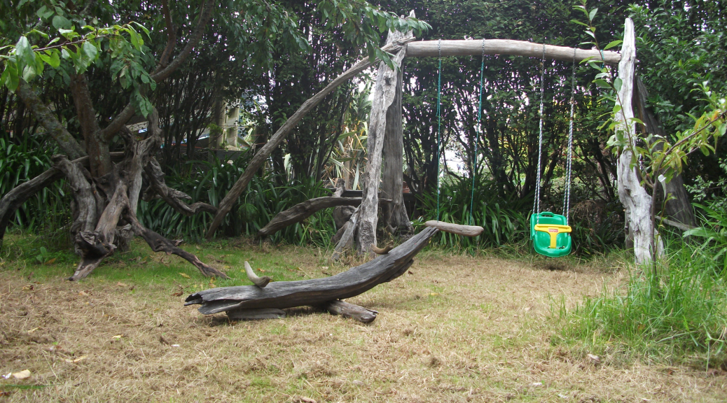 For Verti’s birthday in August I used driftwood to build a fairy village for indoor play and a swing set outside. The totara, matai and rimu timbers are incredibly durable and will last for decades. If I’m still alive when it falls apart, I will remove the treaded rod for reuse or recycling (industrial metabolism) and let the ancient timbers decompose naturally (biological metabolism).