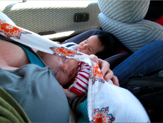 Sometimes we just didn’t have our act together in those early days. And since our baby does her best (read: only) sleeping on me, having some kind of baby-wearing device was totally necessary. When she was little a muslin blanket with the corners tied over my shoulder worked really well.