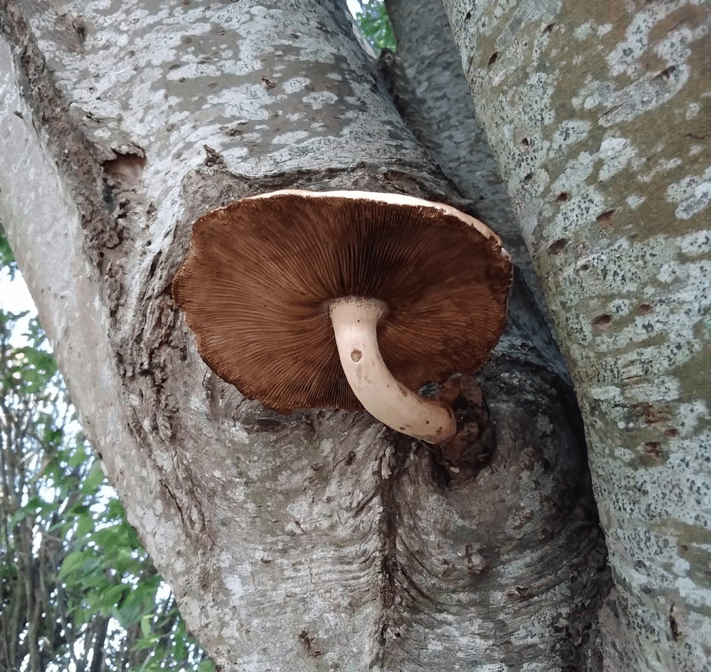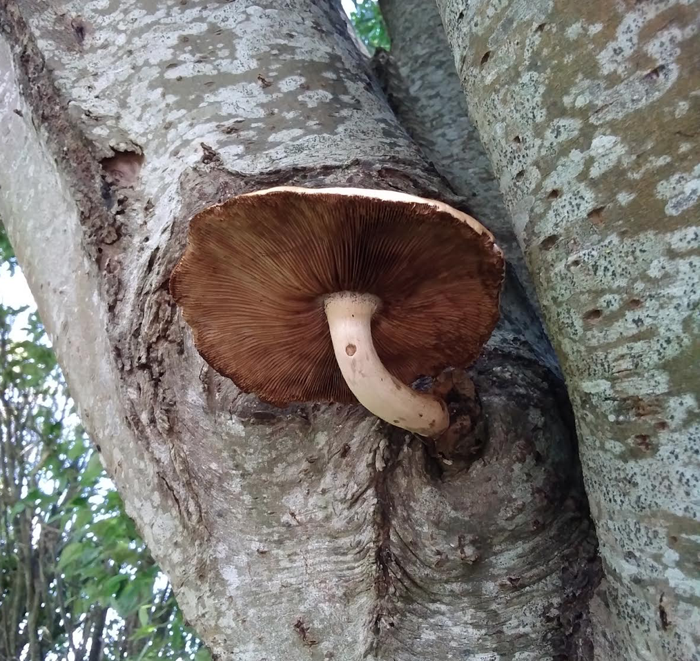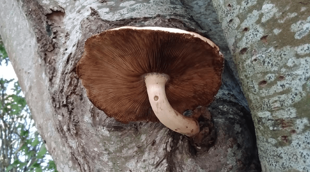 Here is a mushroom growing out of an old snapped limb of this birch tree.