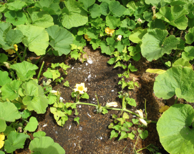 Another way that we achieve high yields is by successive planting. In other words, as soon as one crop comes out another goes in. For example, after harvesting broad beans last spring I immediately planted pumpkins in mounds of compost.