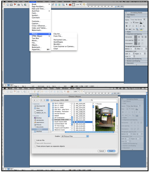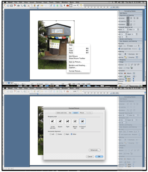 Occasionally you might get a picture that shows up sideways. In that case, after you format it to make it in front of the text, click on the picture. You will notice that your formatting palette gives you lots of options. In the menu “Size, Rotation, and Ordering”, choose “rotation”. You can either turn your picture 90 degrees right or left, or using the free rotate tool grab one of the corners of your picture and spin it.