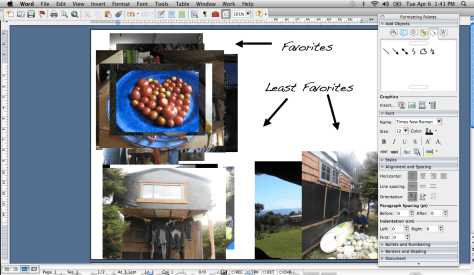 Now you’re done. The last thing you have to do is make it an image so you can post it to the ‘bee. I am a mac user so I do this using the “Screen Shot” feature (Command+Shift+4). However, if you are on a PC you can go to File-Print-PDF, and word will save your file as a PDF. Once you reopen the document in adobe you should be able to save it as another kind of file (like a jpg or png) using the save as feature. Note that you might have to resize your margins because adobe likes to chop things off.
