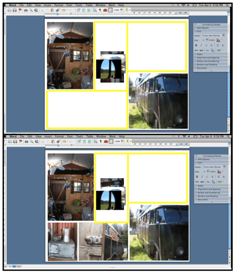 Now you will have some blank spots, which will give you some room to maneuver the pictures. I usually try to pick a central image that most conveys what I’m trying to get across, and make that the largest image. Also keep in mind that images with a lot of detail will need to be larger than simpler images. (For example the interior shot of our house needed to be quite big so that you could see the details).