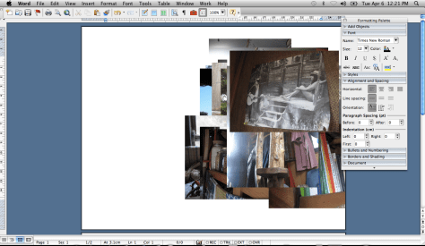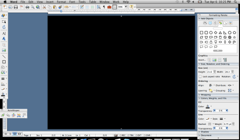 I start with a blank document and change it to “landscape” (File – Page Setup – Orientation). Before I do anything else I always make sure that my formatting palette it showing. It just makes life much easier (View – Formatting Palette). This might also be a trivial detail, but when I’m doing a board I also like to make sure that I can see the entire page (View – Zoom – Whole Page).
