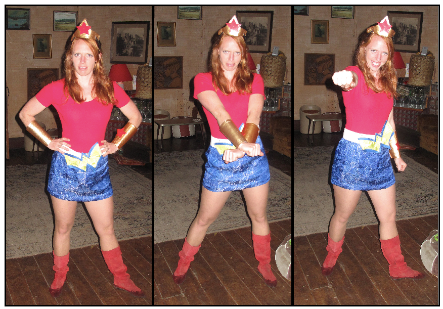 Anyhow, I dressed as Wonder Woman. Me practicing my moves:Confused Wonder Woman. Angry Wonder Woman. I-just-knocked-you out Wonder Woman.