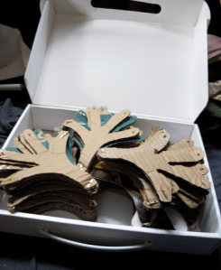 All of the shirts were blank except for this one, which is especially for Veggie Bro bridesman. It has ruffles. And says “Sweetie Pie”. Sweet. We only bought shirts that were half off so we spent about $1.50 per shirt and bought a total of 22 shirts. At Michael’s we picked up some white and black paint and sponge brushes. We couldn’t find the exact stencils we wanted, so in a moment of crafting naievety we decided we could just make them ourselves back at home.