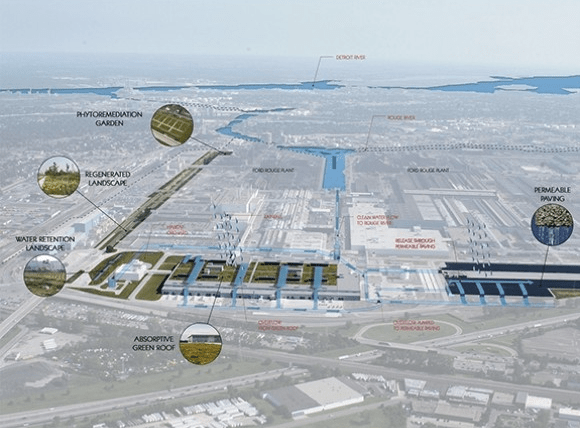 Last week I described how architect and eco-designer William McDonough worked with the Ford Motor Company starting in 1999 to redevelop the historic River Rouge manufacturing plant in Detroit. While the energy performance of the renovated million square metre facility is impressive in and of itself, what is truly remarkable is that McDonough somehow got William Clay Ford Jr. – great grandson of Henry Ford – to embrace eco-design thinking.