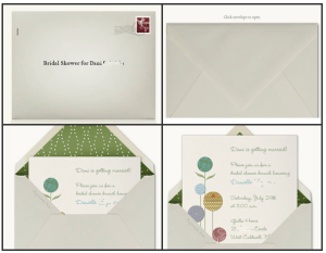 But then I found Paperless Post and the skies began to clear. They have solved the excitement v. eco, pretty v. functional, paper v. e- dilemmas. When you send an invitation through them they send a personalized envelope to each recipient’s email, which they can click on to “open” the invitation. The invitation they open is created by you using one of PP’s gorgeous templates, which are designed to look like letterpress. They can click on the invitation to RSVP. Genius.