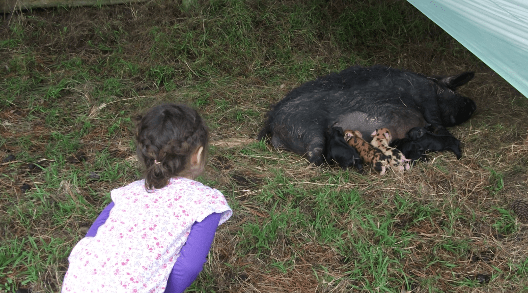 According to The New Zealand Kunekune Association, “The name Kunekune means ‘fat and round’ in Maori. The Kunekune is a unique New Zealand breed of pig. The general consensus is that the Kunekune were probably brought to New Zealand in the 1800’s by whalers operating in New Zealand waters, and were traded with the Maoris. In the late 1970’s the breed was ‘rediscovered’ and at that time it was estimated that there were only about 50 purebred Kunekunes left in New Zealand. From purebred base stock of only 6 sows and 3 boars in 1978, the Kunekune now numbers in the thousands. It is due to the enthusiasm and dedication of people… that the breed was saved from extinction.”