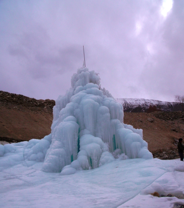 The ingenious artificial glacier, nicknamed the “Ice Stupa,” takes excess winter stream water and freezes it into a giant mound using gravity and the natural sub-zero temperatures of the Trans-Himalaya. In springtime when water is most needed by farmers to germinate their seed in the fields the Ice Stupa provides early meltwater before the higher glaciers begin thawing in early summer.