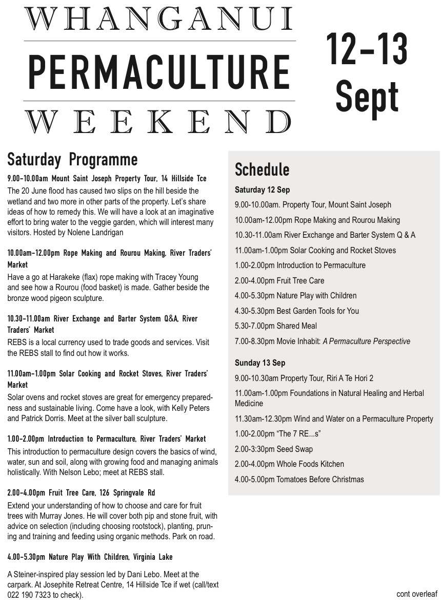 The 7th Annual Whanganui Permaculture Weekend is scheduled for 7th-8th September, following as usual the Festival of Adult Learning (formerly Adult Learner’s Week). Thanks to Adult and Community Education Aotearoa (ACE) we’re able to offer a full week of events for the community in addition to Permaculture Weekend.